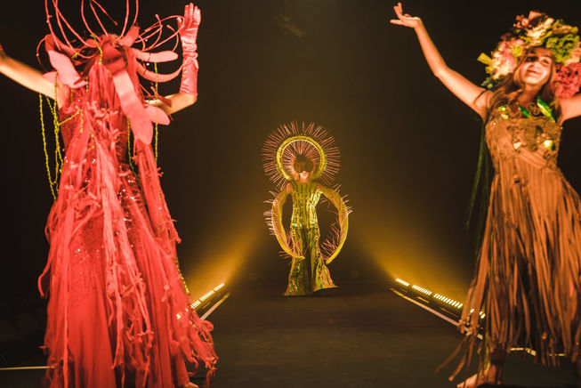 A venus fly trap-inspired wearable art costume made from second-hand and recyclable materials was used in a devised, wearable art show titled Garden of Delights.